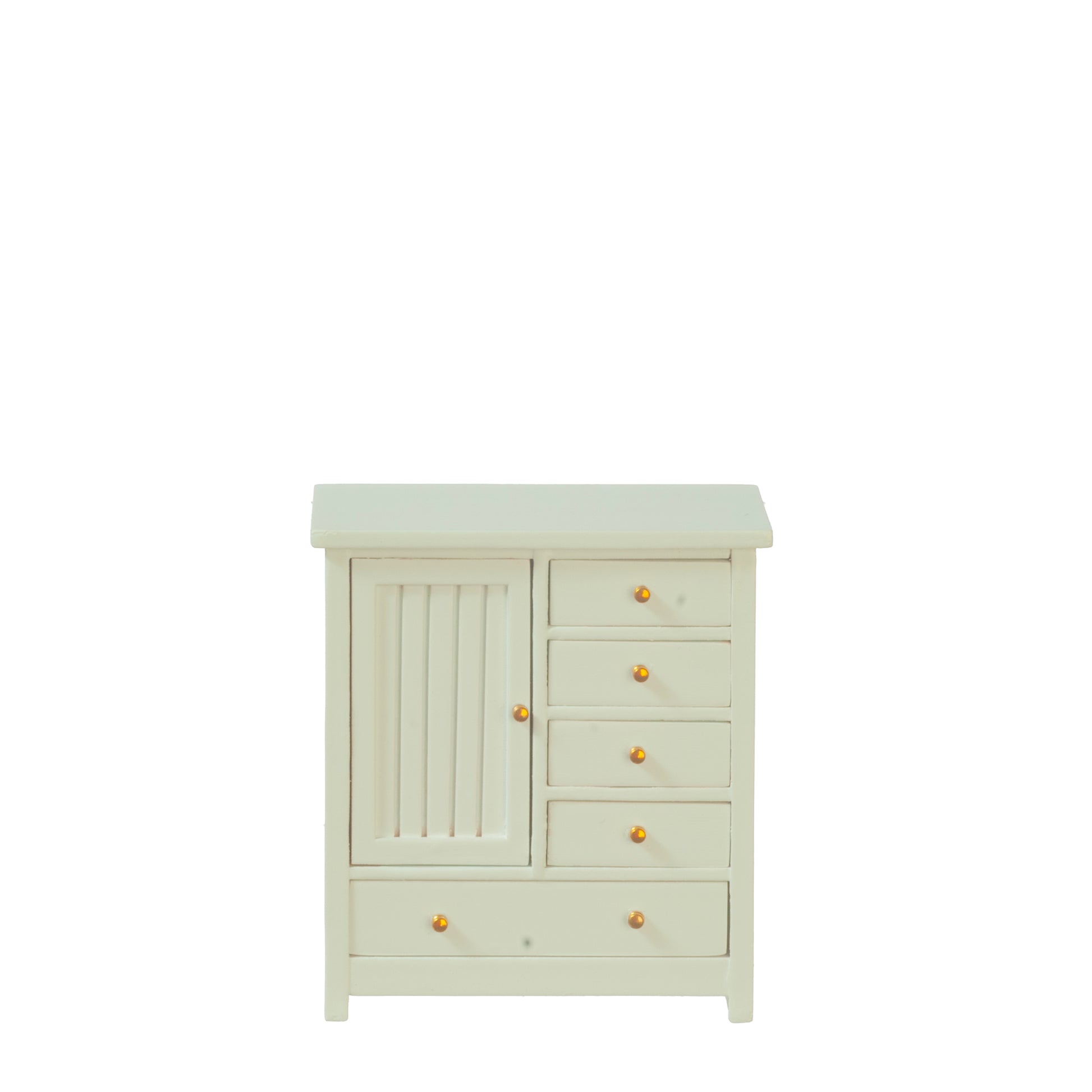 Dimensions (inches): 3"H x 2 5/8"W x 1 3/8"D Style: Modernist, minimalist Features: Paneled door with hanging space, one wide drawer, four side drawers Use: Ideal for organizing miniature clothing or accessories Manufactured by: JBM Miniatures