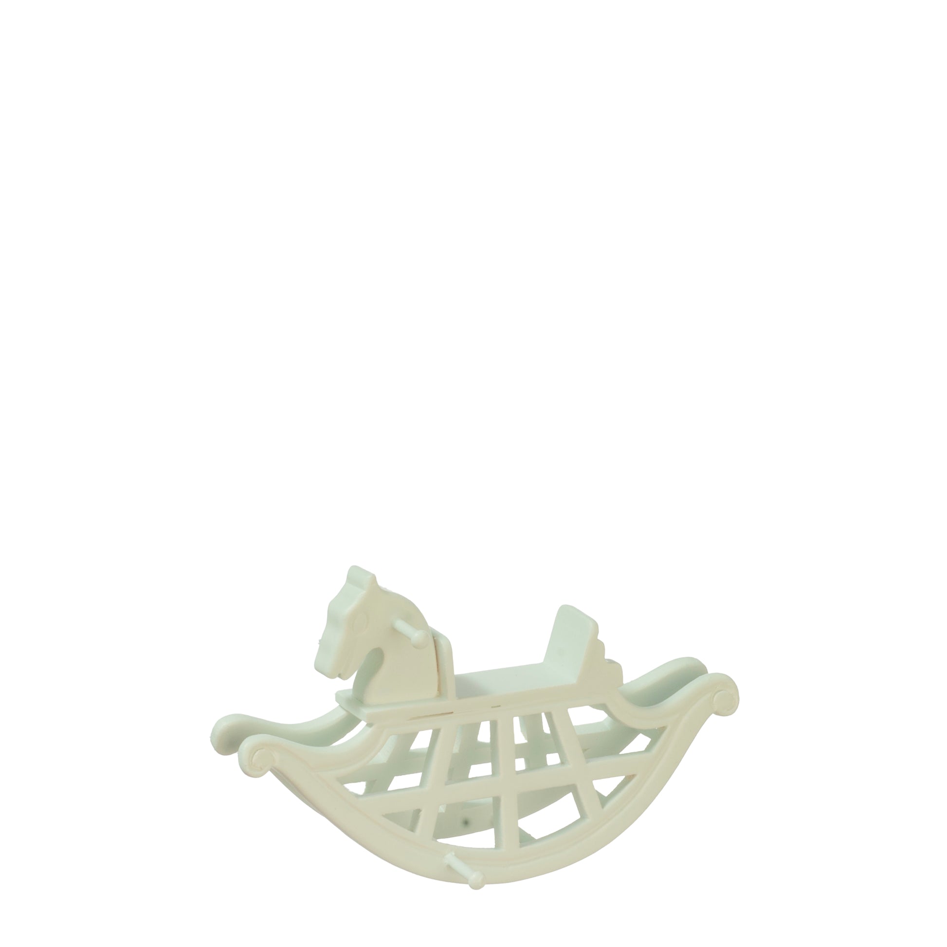 Dimensions (inches): 3 7/8"L x 1 1/8"W x 2 1/8"H Finish: Classic white Features: Handgrips, footrests, smooth rocking motion Use: Ideal for a toddler’s playroom or as a charming dollhouse accessory Manufactured by: JBM Miniatures