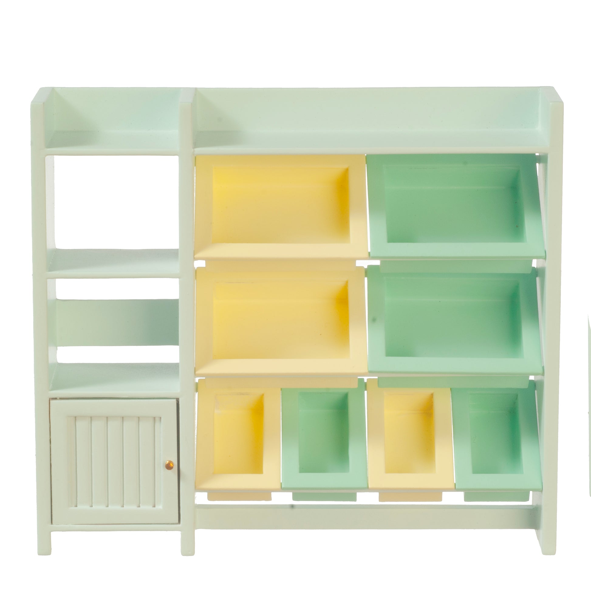 This miniature shelf unit, designed in a modernist style, is both undecorated and functional, making it a versatile storage solution for any child’s bedroom or playroom. The unit features slanted shelves with removable trays, allowing flexible storage for toys, books, or folded clothes. When the trays are removed, the shelves can be used for books or neatly organized clothing, offering multiple display and storage options.